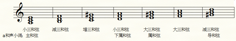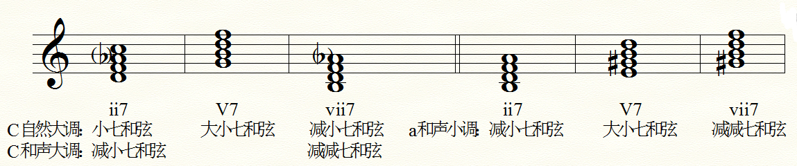 和声小调有三个七和弦:ii级(减小七和弦)、V级(大小和弦)、vii级(减减七和弦)