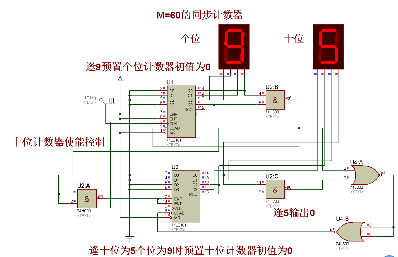 MSI计数器组成一个起始状态为060进制同步加法计数器,并测试其输入和输出的同步波形,以检测电路的逻辑功能是否正确。