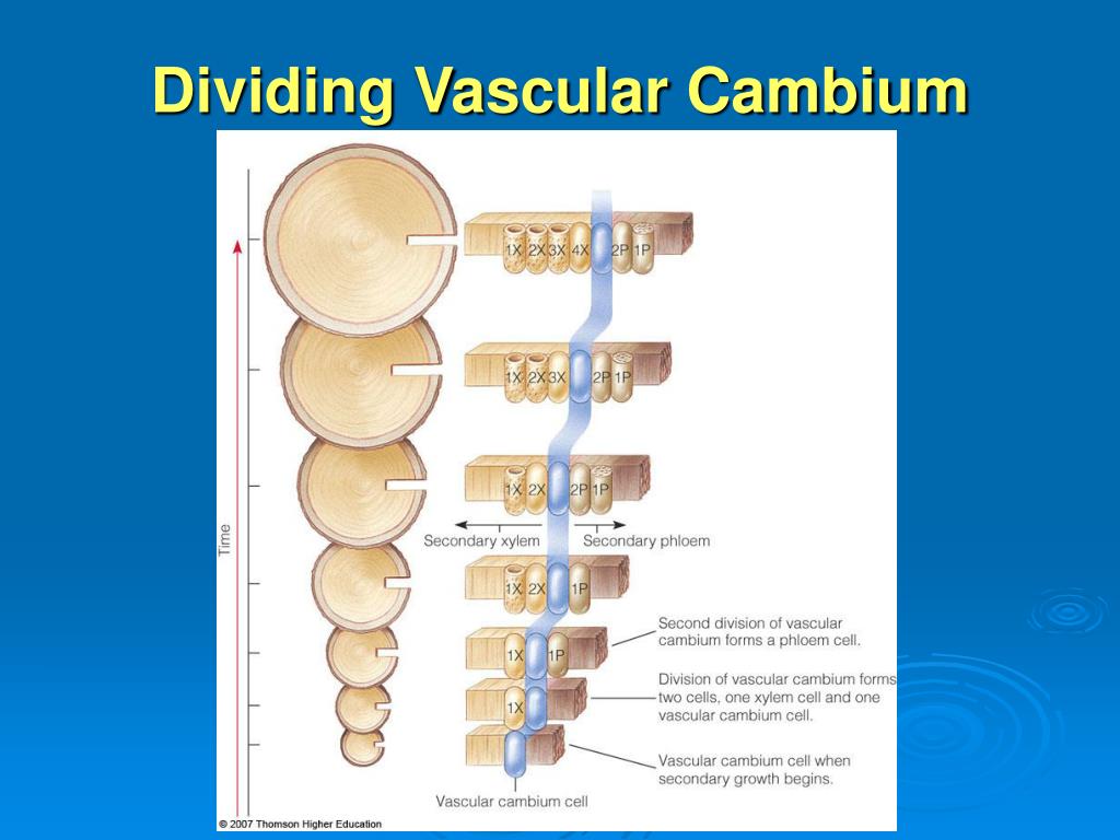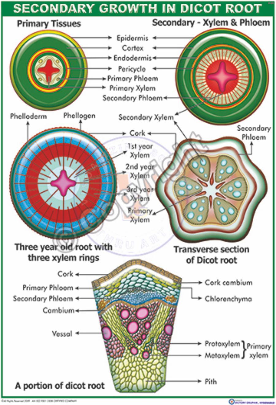 In secondary growth, primary tissues and residual meristematic tissues produce secondary meristems, which then produce secondary tissues. Whereas primary tissues allow for vertical growth, secondary tissues allow for lateral growth: they allow stems and roots to become wider by producing wood. In addition to growing wider, secondary growth exchanges the living epidermis for a thick layer of dead, waterproofed cells called cork. The cork and a few other layers of tissue comprise something called the periderm, or perhaps more familiarly called bark.