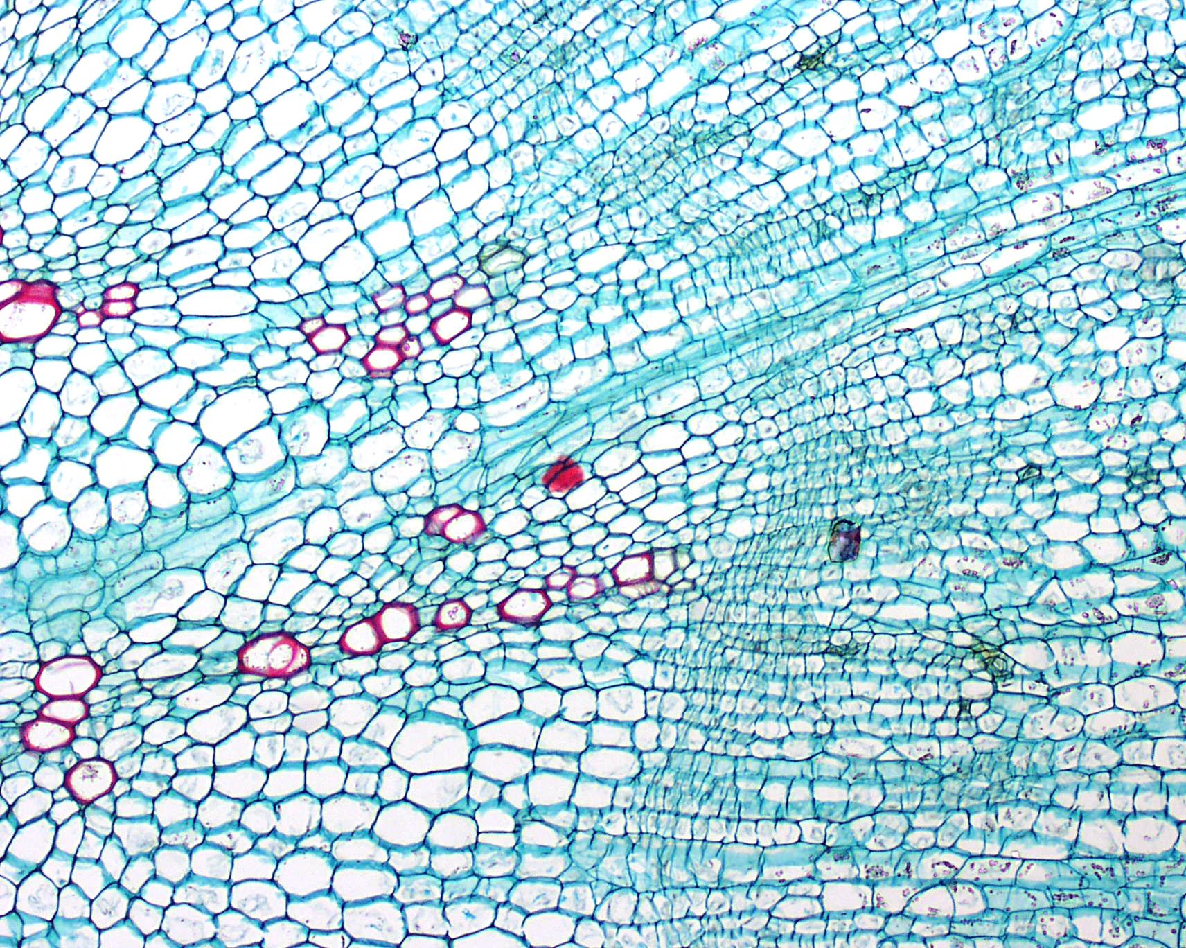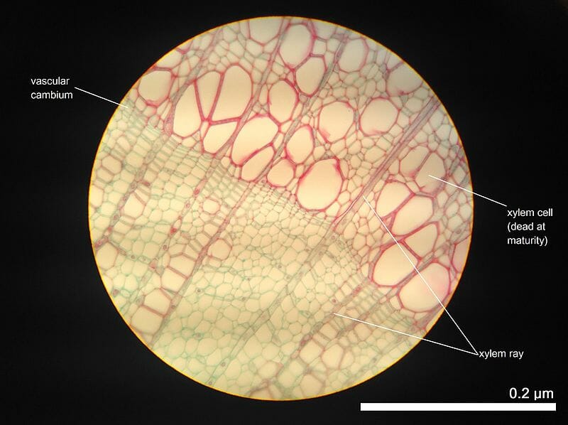 Figure \(\PageIndex{1}\): A cross section of a pine root in the early stages of primary growth. The first layer of periderm is forming, causing the epidermis to slough off. The periderm is currently the outermost layer, compose of a few layers of suberized cork cells, the cork cambium, and large cells called the phelloderm. The cortex is just inside the phelloderm and is getting smaller as the root grows. Ranks of cells just inside the cortex are secondary phloem cells (stained a blue-green color) which are being produced by the vascular cambium (a ring of cells stained light blue between the xylem and phloem). Just within the vascular cambium, making up the center of the root, is the secondary xylem (stained red, due to the secondary wall). There are large holes in the secondary xylem where resin canals are traveling through. Strings of parenchyma cells traverse laterally through the vascular tissue. These are called xylem rays and phloem rays, depending on their location within the vascular tissue. Image from Berkshire Community College Bioscience Image Library, CC0, via Wikimedia Commons.