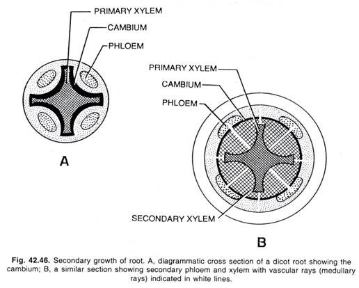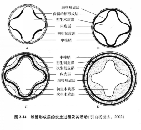 维管形成层(环)形成后,主要是进行切向平周分裂。向内分裂产生的细胞形成新的本质部,加在初生木质部的外方,称为次生木质部;向外分裂产生的细胞形成新的韧皮部,加在初生韧皮部的内方,称为次生韧皮部。次生木质邵和次生韧皮部,合称为次生维管组织,是次生结构的主要部分。在具有次生生长的根中,次生木质部和次生韧皮部间始终存在维管形成层。次生水质部和次生韧皮邵的组成,基本上和初生结构中相似,但次生韧皮部中,韧皮薄壁组织较为发达,韧皮纤维的含量较少。另外,在次生木质邰和次生韧皮部内,还有一些径向排列的薄壁细胞群,称为木射线( xylem ray )和韧皮射线( phloem ray),统称为维管射线( vascular ray)(图2-15)。维管射线是次生结构中新产生的组织,它从形成层处向内外贯穿次生木质部和次生韧皮部,作为横向运输的通道和结构。次生木质部导管中的水分和无机盐,就可以通过维管射线运送到形成层和次生韧皮部。同样,次生韧皮部中的有机养分,也叮以通过维管射线运送到形成层及次生术质部。维管射线的形成,使根的维管组织内有轴向系统(导管,管胞、筛管、伴胞,纤维等)和径向系统(射线)之分。