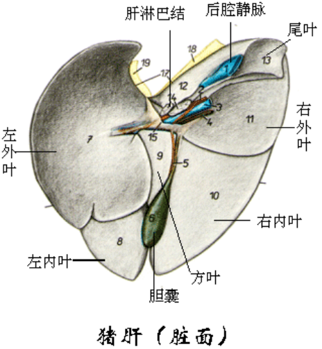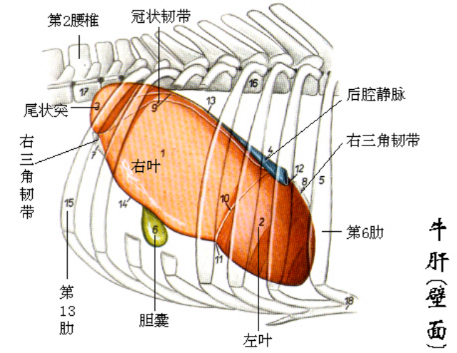 位于季肋部和剑状软骨部,大部分位右季肋部。肝的中央厚而周缘薄,腹侧缘有三条深切迹,将肝分为明显的四叶:左外叶、左内叶、右内叶、右外叶。另外在右内叶的内侧有不发达的中叶,被肝门分为尾叶和方叶。胆囊位于右内叶脏面,胆囊管与肝管汇合成胆管。