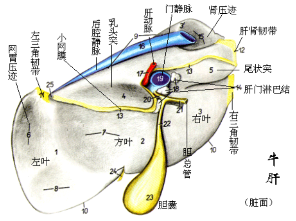 略呈长方形,因受瘤胃挤压而全部位于右季肋部。肝的壁面(前面)凸,与膈接触;脏面(后面)凹与网胃、瓣胃、皱胃和十二指肠接触。在脏面中央有血管、神经、淋巴管、肝管等进出肝称肝门。肝的脏面还有呈梨状的胆囊,胆囊管与肝管汇合成一短的胆总管,开口于十二指肠。羊的胆总管与胰管合成一总管,开口于十二指肠。肝的背侧缘厚,右侧有一后腔静脉从此通过,静脉壁与肝组织连在一起。肝的腹侧缘较薄,可由胆囊和左侧的脐切迹分为左、中、右三叶。中叶又可被肝门分为背侧的尾叶和腹侧的方叶。