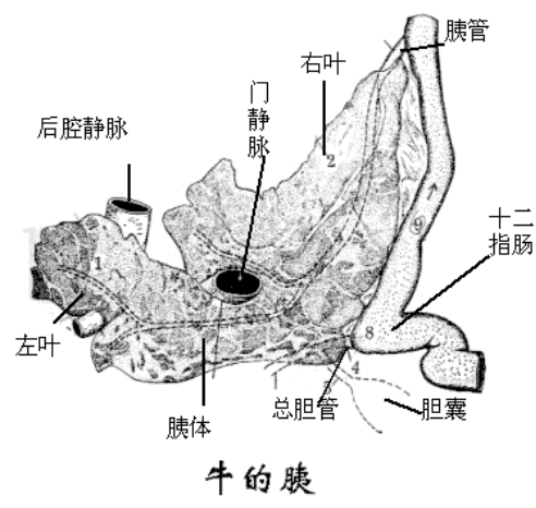 位于肝门的正后方、十二指肠弯曲内,近似四边形,可分为胰头(中叶)、左叶和右叶。牛的胰管自右叶发出,开口于十二指肠。