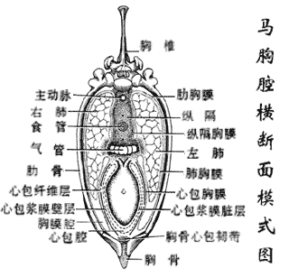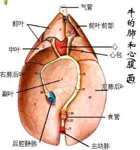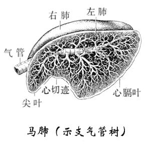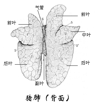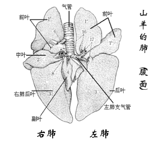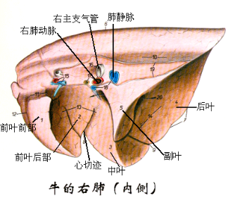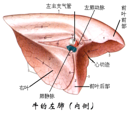 肺的分叶:马肺分叶不明显,以心切迹前、后分为尖叶、心膈叶,右肺在心膈叶内侧还有一副叶;牛、羊和猪的肺分叶明显,左肺分3叶,依次分为尖叶(前叶)、心叶(中叶)和膈叶(后叶),右叶分4叶,包括尖叶,心叶,膈叶和副叶。