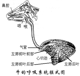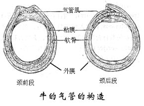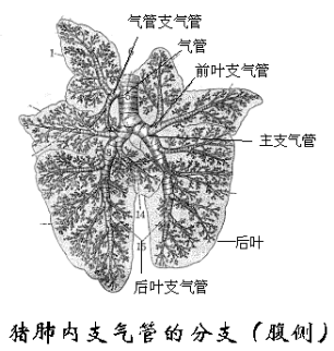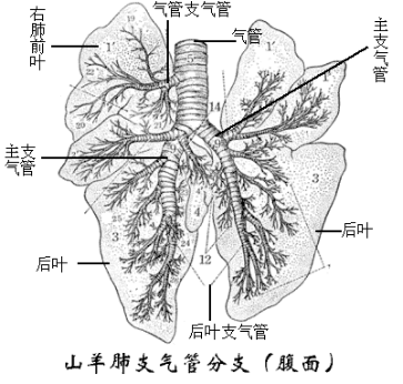 气管为一条圆筒状长管,由喉向后沿颈部腹侧正中进入胸腔,然后经心前纵隔达心基背侧分为左右两主支气管分别进入左右肺脏。牛羊猪在分出主支气管前还分出右尖叶支气管进入右肺前叶。