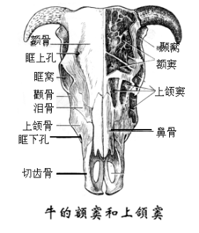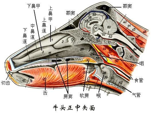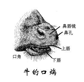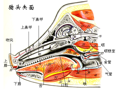 鼻前庭:为鼻腔前部衬有皮肤的部分,有鼻泪管的开口。鼻孔为鼻腔入口,由内、外侧鼻翼围成。牛两鼻孔之间与上唇中部的皮肤形成鼻唇镜。猪鼻尖与上唇一起构成吻突。鼻孔小,呈圆形,位于吻突上,由内、外侧鼻翼围成,并有吻骨和软骨支撑。