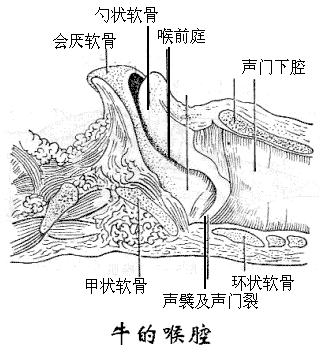 喉软骨彼此借关节和韧带等连成支架,内衬黏膜所构成的腔隙,称喉腔。喉腔前方以喉口开口于咽,后部向后直通气管。猪喉较长,喉前庭较宽,声门裂和声门下腔狭窄。