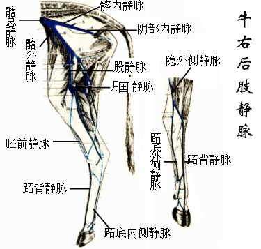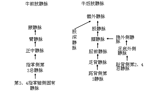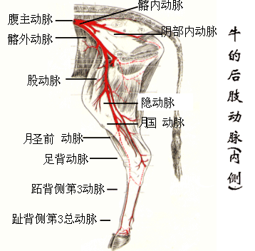 后肢动脉:髂外动脉—股动脉—月 动脉—胫前动脉—足背侧动脉 —跖背侧第3动脉—趾背侧第3总动脉-趾背侧固有动脉