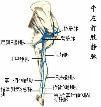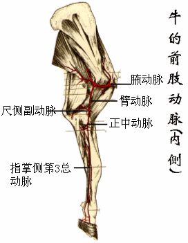 前肢动脉:动脉—臂动脉—正中动脉—指掌侧第3总动脉—第3.4指掌轴侧固有动脉