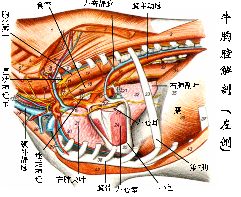 肺动脉的左、右两支分别与左、右支气管一起经肺门入肺。牛和羊的右肺动脉在入肺前还分出一支到右肺的尖叶。肺动脉的分支入肺后,在肺内伴随支气管反复分支,最终在肺泡周围形成毛细血管网。
