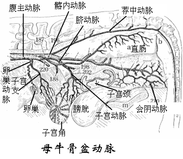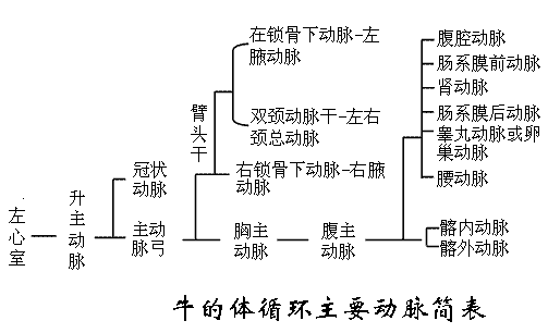 体循环的动脉为主动脉,由左心室发出,先向上,再向后弯曲,然后沿脊柱腹侧向后,至第5腰椎处分为左、右髂外动脉。左右髂内动脉及荐中动脉。