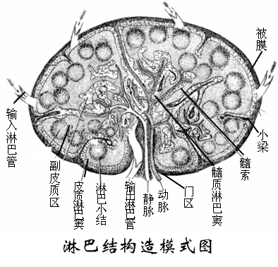 淋巴结为动物体内淋巴回流通路中的次级淋巴器官。其大小不等,形态不一。一般呈豆形,表现被覆结缔组织被膜并伸入实质内形成小梁,数条输入淋巴管从四周穿过被膜,经实质的淋巴窦汇集成输出淋巴管,从淋巴结的凹陷部,即门区出淋巴结,此外,门区亦是血管、神经的通道。实质分为外周的皮质部和中央的髓质部。皮质部由淋巴小结、副皮质区和皮质淋巴窦构成;髓质部由髓索和髓质淋巴窦构成。