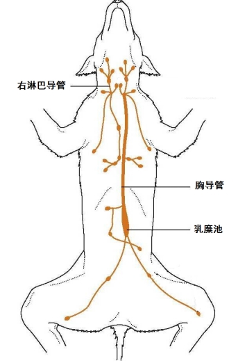 收集后肢、盆部、腹部、左肺、左心、左胸壁、左前肢和左头颈部等约全身3/4淋巴的淋巴导管,是全身最粗大的淋巴管。胸导管由左右腰干和内脏干汇合而成,汇合处稍膨大称乳糜池。