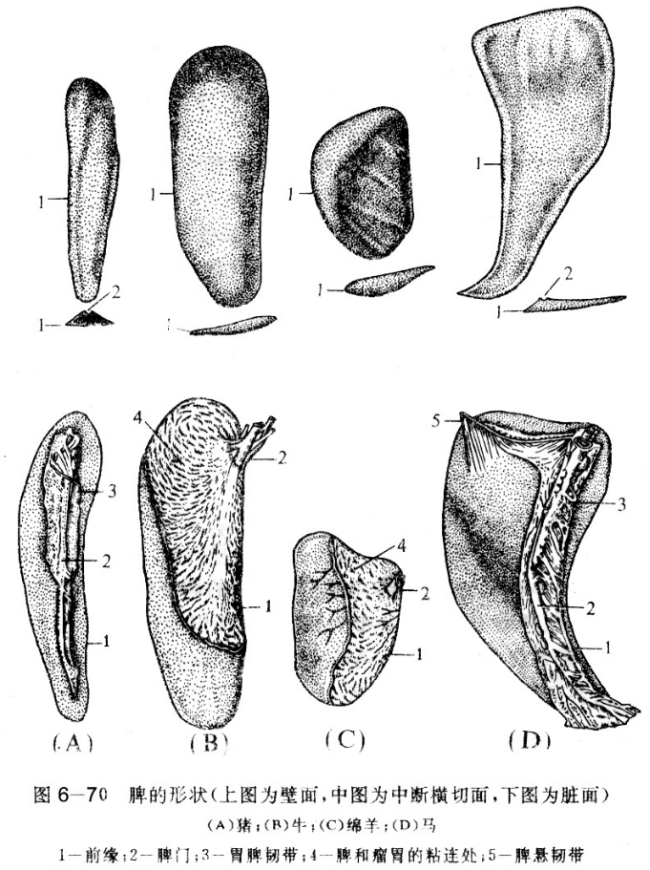 脾是体内最大的淋巴器官,分布在血液循环的经路上。各种家畜的脾均位于腹前部、胃或瘤胃的左侧。猪的脾呈狭而长的条状,牛的呈长而扁的椭圆形,羊的脾呈扁的纯三角形羊脾呈扁平的钝三角形。脾由间质和实质构成。间质包括表面的被膜和伸入实质的小梁,形成网状支架。实质由白髓和红髓组成。
