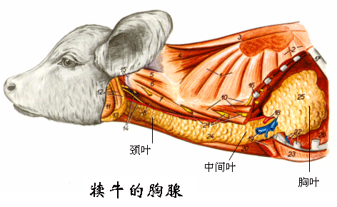 牛的胸腺为粉红色的分叶状器官,质地柔软。犊牛胸腺发达,分为颈叶、中间叶和胸叶。