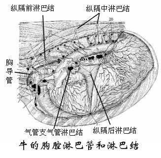 胸部淋巴中心有4个。即胸背侧淋巴中心,有胸主动脉淋巴结和肋间淋巴结。胸腹侧淋巴中心,有胸骨淋巴结和膈淋巴结。纵隔淋巴中心,有纵隔前、中、后淋巴结。支气管淋巴中心,有气管支气管左、中、右淋巴结和肺淋巴结等。