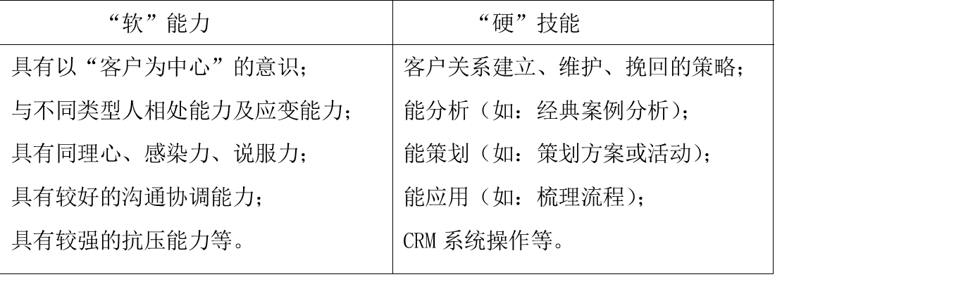 (四)素质目标:强化“以客户为中心”的意识,提升与不同类型人相处及应变能力;提高说服力、感染力,沟通协调能力及抗压能力。