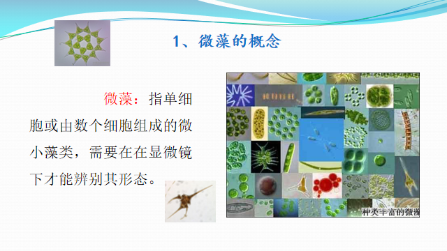 前面给大家介绍了微藻的定义,从概念中大家思一下考微藻有哪些特征呢,第一微藻个体微小,形态结构简单,所以我们必须要借助显微镜才能观察到它的具体形态。第二,微藻像花草树木一样具有叶绿素;第三,微藻能吸收光能和营养盐进行光合作用制造有机物质,第四,微藻不开花,没有根茎叶的分化,第五,微藻生殖器官简单,有单细胞的孢子或者合子。