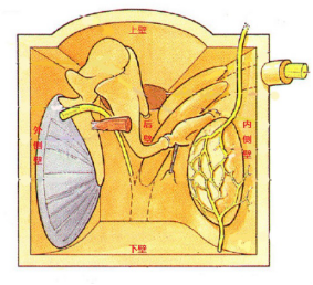 内侧壁 | 迷路壁 | 邻内耳,有岬、前庭窗、蜗窗、面神经管凸等结构 |