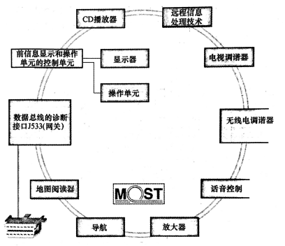 统。该数据总线系统起源于。面向媒体的系统传送(MOST)合作组织。这是一个由各种汽车制造厂及其供货商和软件公司组成的协会,其目的是要开发出一个标准的高速数据传送系统。术语。面向媒体的系统传送。代表一个以媒体为本的数据传送网络,这意味着与CAN数据总线相反,以地址为本的信息被传送到特定的接收机。这一技术被用在Audi汽车上来传送文娱新闻的系统数据。文娱新闻系统提供如下描述的各种各样现代的信息和娱乐媒介(图 4-13)