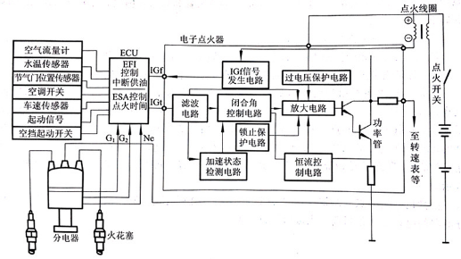 ECU 根据各传感器和开关信号确定点火时刻,并将点火正时信号IGt送至电子点火器,当IGt信号变为低电平时,功率管截止,点火线圈初级电路断开,在次级线圈中感应出高