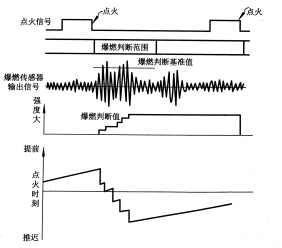 示爆燃程度超过规定的限度,ECU立即发出指令推迟点火当爆燃程度低于规定的限度时,ECU又会将点火时刻提前,循环调节点火时刻,使发动机始终处于临界爆燃的工作状态,从而使发动机的动力性、燃油经济性得到一定程度的改善。