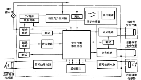 使两极接通,接通电爆管电路;反之,当碰撞以外的原因,即使前安全气囊传感器或中央安全气囊传感器有信号输出,由于安全传感器无信号输出,则可判定车辆没有发生正面碰撞,不输出点火信号。这样可以防止在不必要的情况下打开安全气囊。