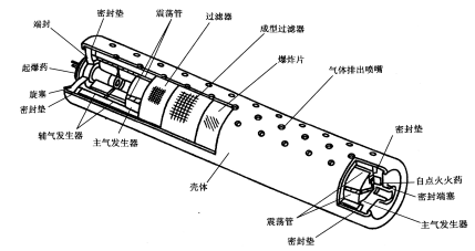 气体发生器又称充气器,用于在点火器引爆点火剂时产生气体向气囊充气,使气囊膨
