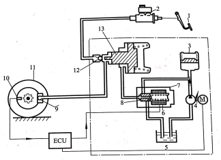 8-柱塞;9-制动轮缸;10-转速传感器;11-车轮;12-单向阀;13-控制活塞