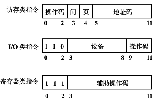 1)PDP – 8的指令字长固定12 位,CPU内只设一个通用寄存器,即累计器ACC,其主存被划分为若干个容量相等的存储空间,该机的指令格式可分为三大类,如下图所示。