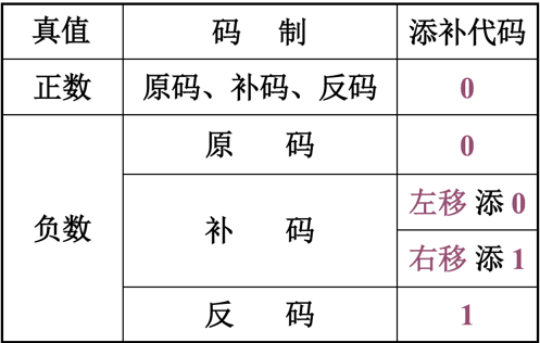 对于正数,由于[x]原=[x]补=[x]反=真值,故移位后出现的空位均以0添之。对于负数,由于原码、补码和反码的表示形式不同,故当机器移位时,对其空位的添补规则也不同。下表列出了三种不同码制的机器数(整数或小数均可),分别对应正数或负数移位后的添补规则。必须注意的是:不论是正数还是负数,移位后其符号位均不变,这是算术移位的重要特点。