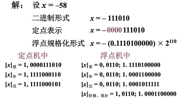 例2:将–58 表示成二进制定点数和浮点数,并写出它在定点机和浮点机中的三种机器数及阶码为移码、尾数为补码的形式(其他要求同上例)。