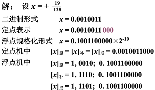 例1:将+写成二进制定点数、浮点数及在定点机和浮点机中的机器数形式。其中数值部分均取10位,数符取1位,浮点数阶码取5位(含1位阶符)。