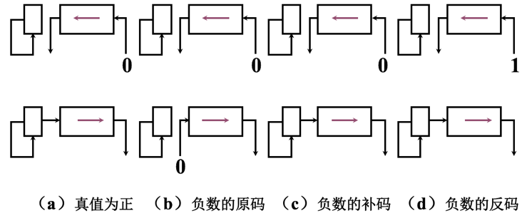 下图示意了机器中实现算术左移和右移操作的硬件框图。其中图(a)为真值为正的三种机器数的移位操作;图(b)为负数原码的移位操作;图(c)为负数补码的移位操作;图(d)为负数反码的移位操作。