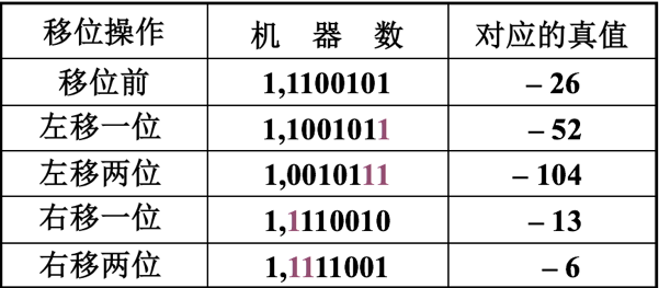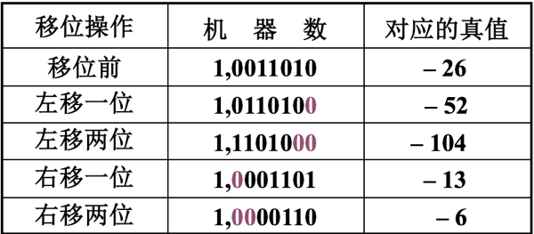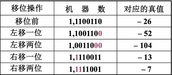 例2:设机器数字长为8 位(含1位符号位),写出A = –26时,三种机器数左、右移一位和两位后的表示形式及对应的真值,并分析结果的正确性。