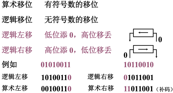 有符号数的移位称为算术移位,无符号数的移位称为逻辑移位。逻辑移位的规则是:逻辑左移时,高位移丢,低位添0;逻辑右移时,低位移丢,高位添0。例如,寄存器内容为01010011,逻辑左移为10100110,算术左移为00100110(最高数位“1”移丢)。又如,寄存器内容为10110010,逻辑右移为01011001,若将其视为补码,算术右移为11011001.显然,两种移位的结果是不同的。总结为下: