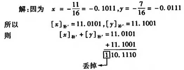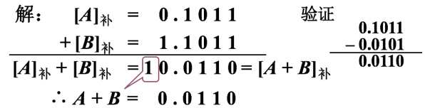 按模2的意义,最左边的1丢掉,故[A+ B]补=0.0110,结果正确。