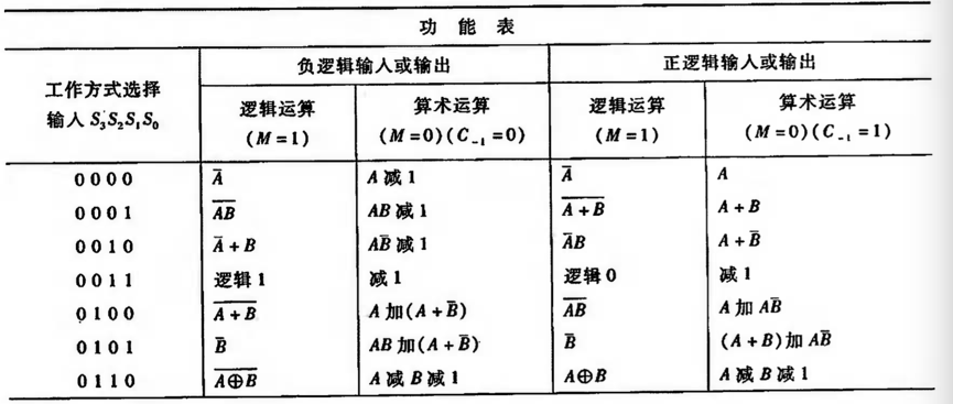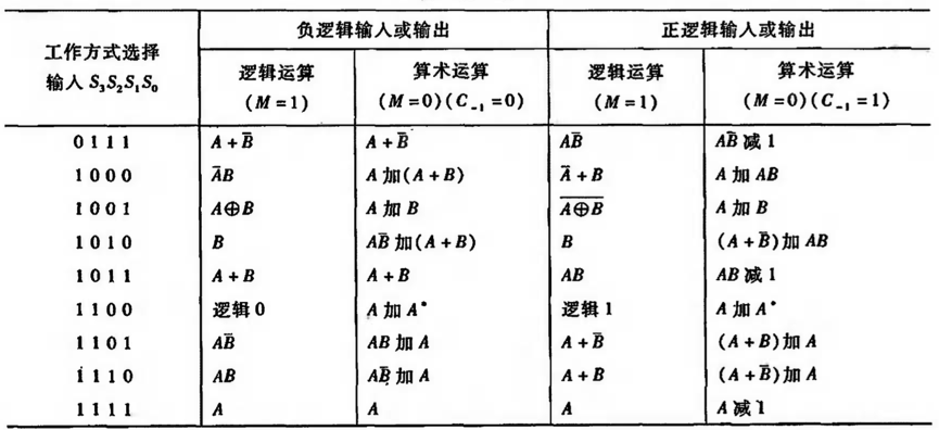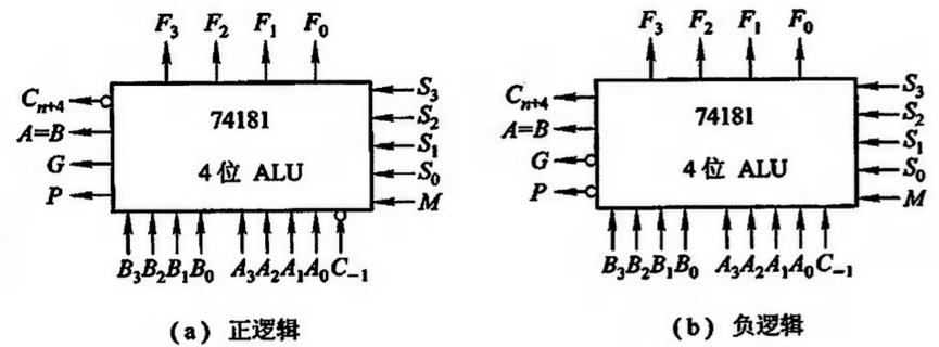 74181有两种工作方式,即正逻辑和负逻辑,分别如图(a)和图(b)所示。下表列出了其算术/逻辑运算功能。