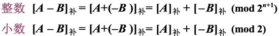 因此,若机器数采用补码,当求A-B时,只需先求[-B]补(称[-B]补为“求补”后的减数),就可按补码加法规则进行运算。而[-B]补由[B]补连同符号位在内,每位取反,末位加1而得。