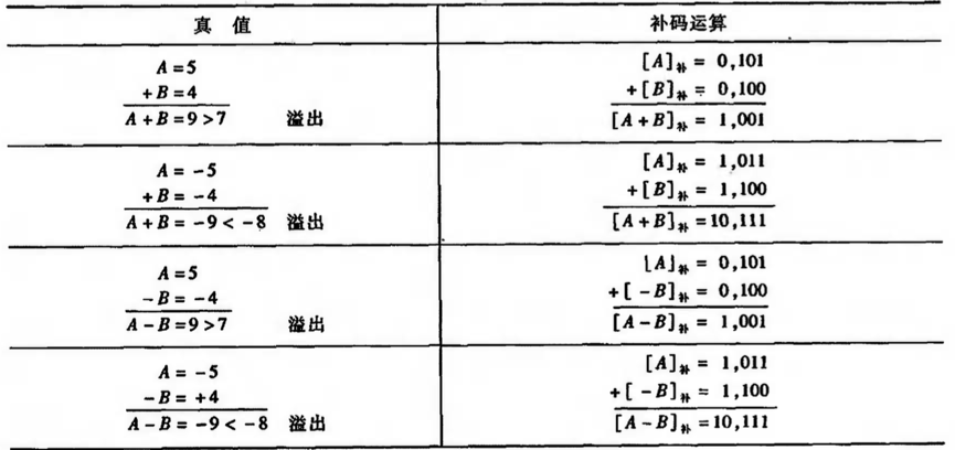 机器字长为4位的补码所对应的真值范围为-8~+7,运算结果一旦超过这个范围即为溢出。下表列出了四种溢出情况。