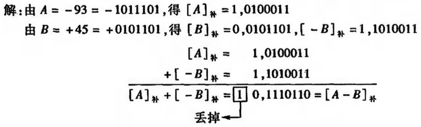 例4:设机器数字长为8 位(含1 位符号位),且A = –93,B = 45,用补码求A–B。