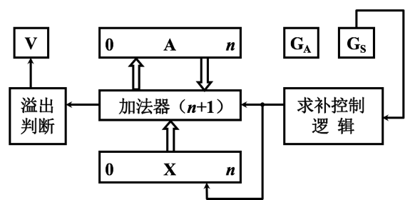 图中寄存器A、X、加法器的位数相等,其中A存放被加数(或被减数)的补码,X存放加数(或减数)的补码。当作减法时,由“求补控制逻辑”将X送至加法器,并使加法器的最末位外来进位为1,以达到对减数求补的目的。运算结果溢出时,通过溢出判断电路置“1”溢出标记V。GA为加法标记,GS为减法标记。