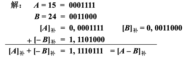 例3:设机器数字长为8 位(含1 位符号位),且A = 15,B = 24,用补码求A–B。