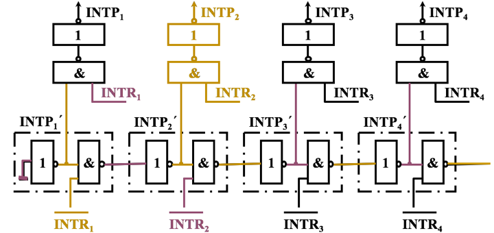 图中厦门的一排门电路是链式排队器的核心。每个接口中有一个反相器和一个“与非”门(如图中点画线框内所示),它们之间犹如链条一样串接在一起,故称为链式排队器。该电路中级别最高的中断源是1号,其次是2号、3号、4号。不论是哪个中断源提出中断请求,排队器输出端INTPi只有一个高电平。