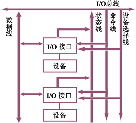 下图所示为总线结构的计算机,每一台I/O设备都是通过I/O接口挂到系统总线上的。图中的I/O总线包括数据线、设备选择线、命令线和状态线。