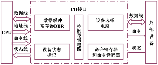 ⑥I/O设备需将其工作状态(如“忙”、“就绪”、“错误”、“中断请求”等)及时向CPU报告,通过接口可监视设备的工作状态,并可保存状态信息,供CPU查询。