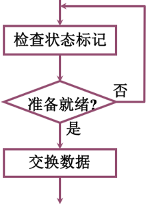 将I/O接口中的设备状态标志取至CPU并测试I/O设备是否准备就绪。如果未准备就绪,则等待,直到准备就绪为止。当准备就绪时,接着可实现传送。对输入而言,准备就绪意味着接口电路中的数据缓冲寄存器已装满欲传送的数据,称为输入缓冲满,CPU即可取走数据;对输出而言,准备就绪意味着接口电路中的数据已被设备取走,故称为输出缓冲空,这样CPU可再次将数据送到接口,设备可再次从接口接收数据。