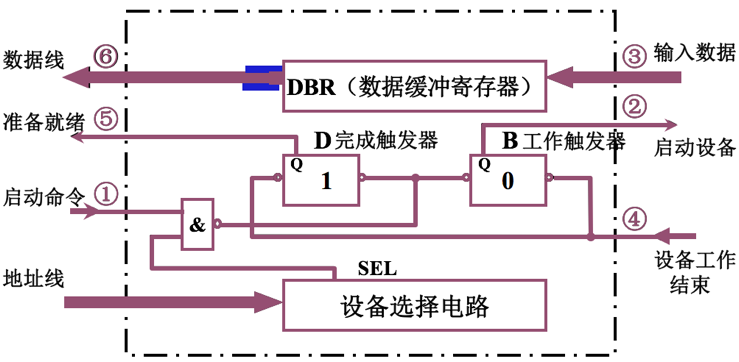 ⑥由设备发设备工作结束信号,将D置“1”,B置“0”,表示外设准备就绪。