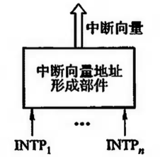 中断向量地址形成部件的输入时来自排队器的输出INTP1、INTP2…INTPn,它的输出时中断向量,其位数与计算机可以处理中断源的个数有关,即一个中断源对应一个向量地址。可见,该部件实质上是一个编码器。在I/O接口中的编码器又称为设备编码器。